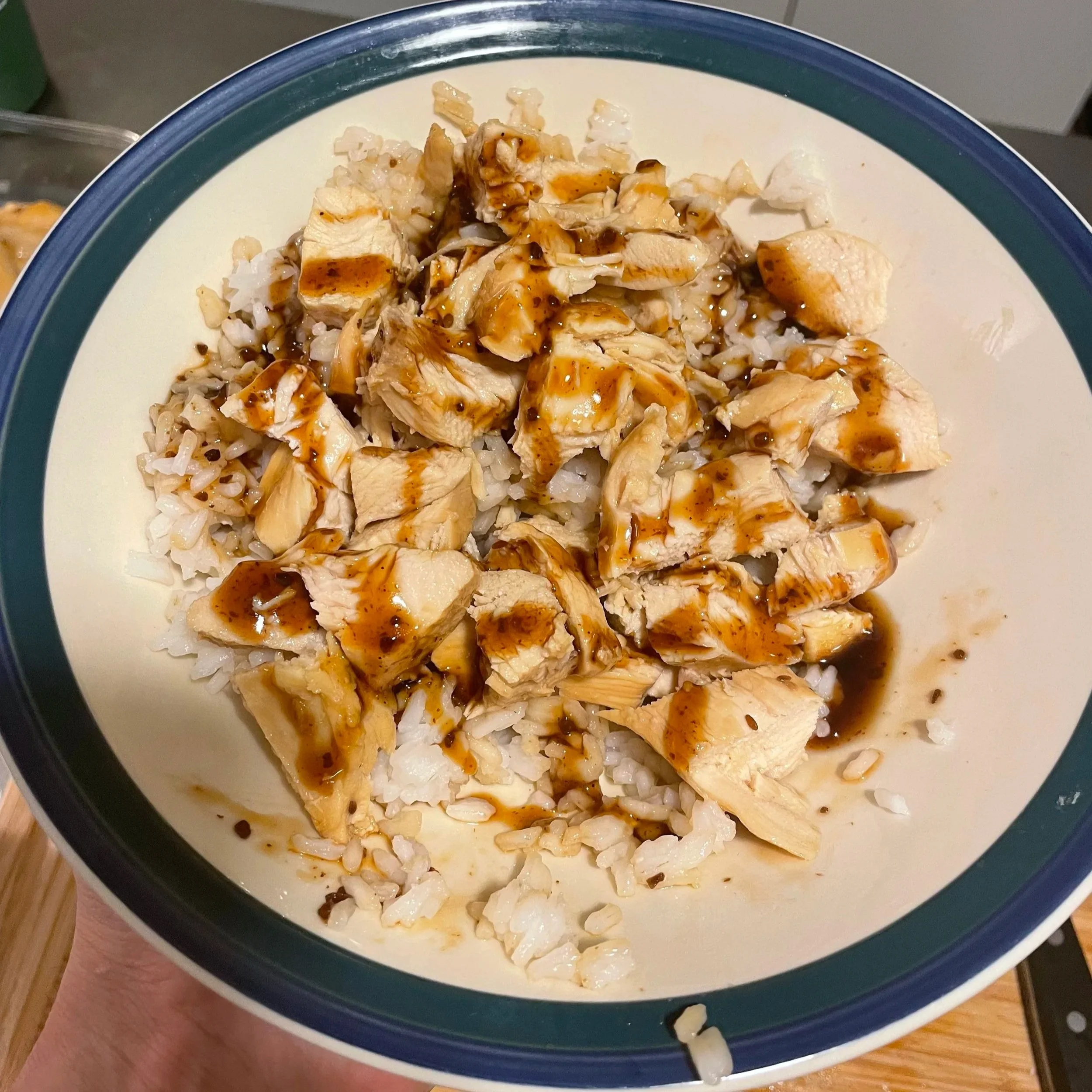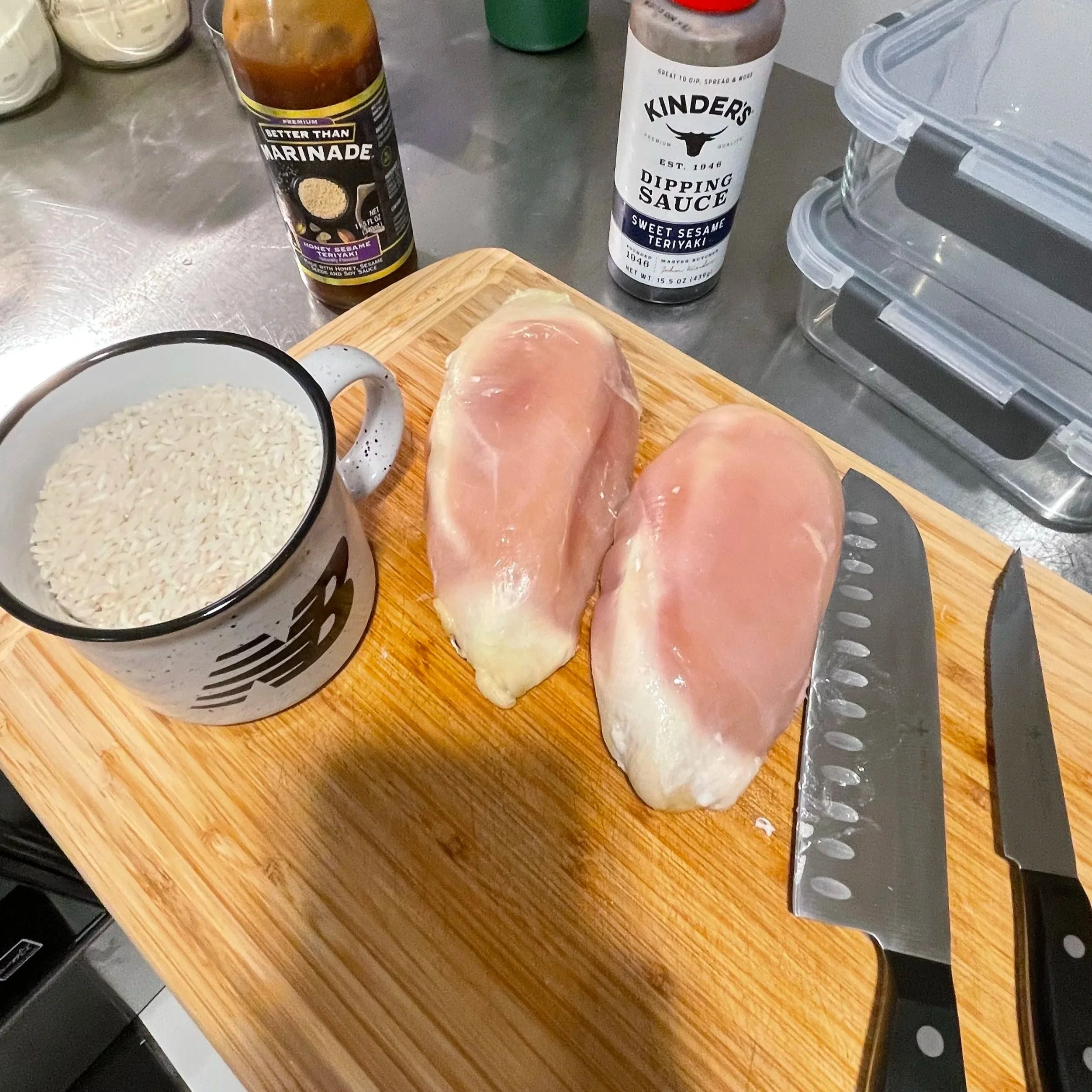chicken and rice bowl with Kinder’s Sesame Teriyaki Dipping Sauce.